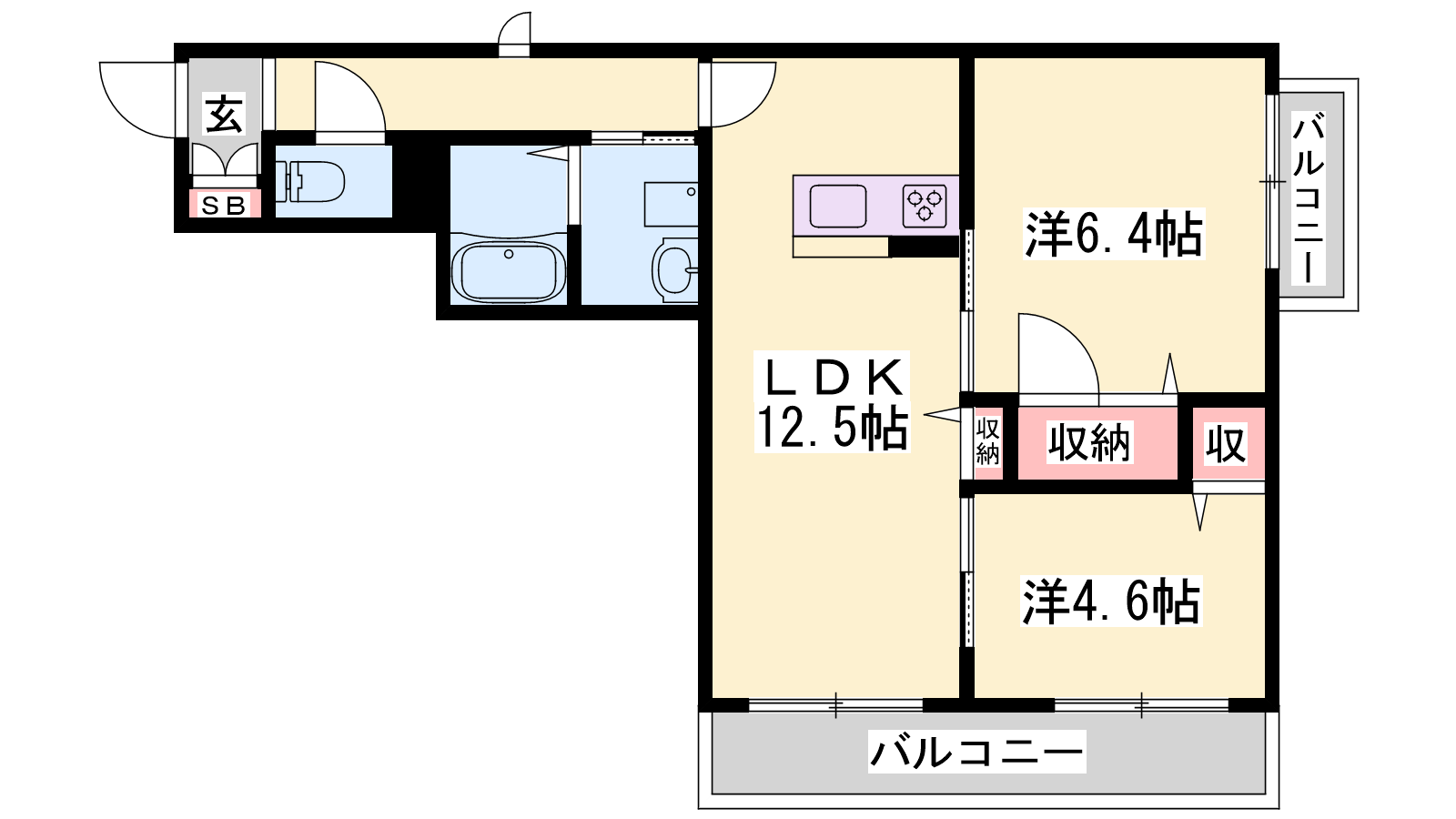 - LDK12.5帖、洋室6.4帖、洋室4.6帖