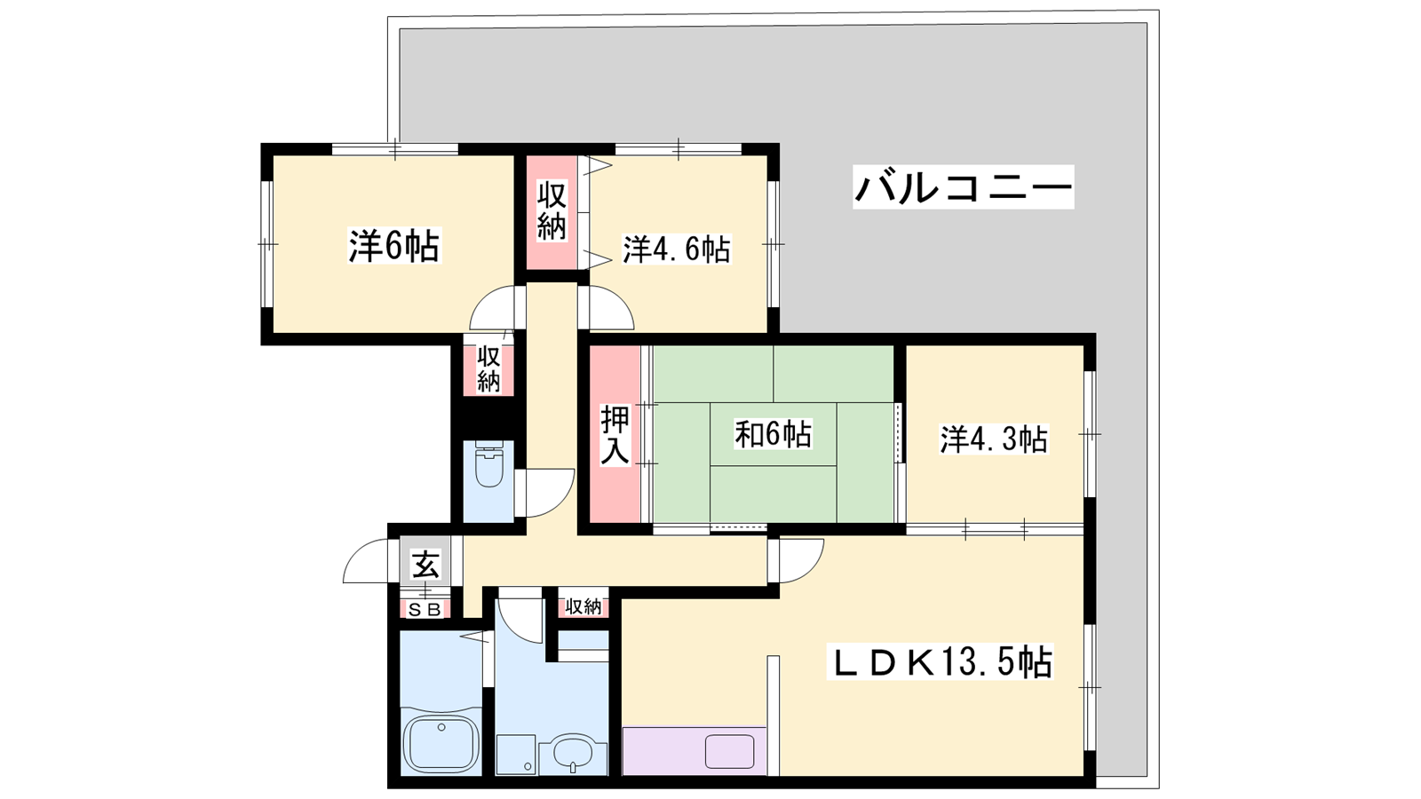 - LDK13.5帖、洋室6帖、洋室4.6帖、洋室4.3帖、和室6帖