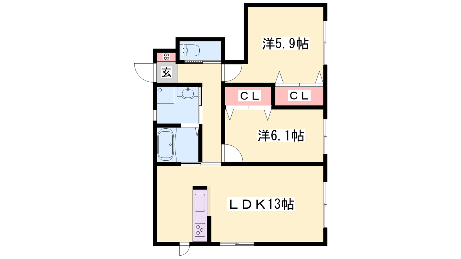 - LDK13帖、洋室6.1帖、洋室5.9帖