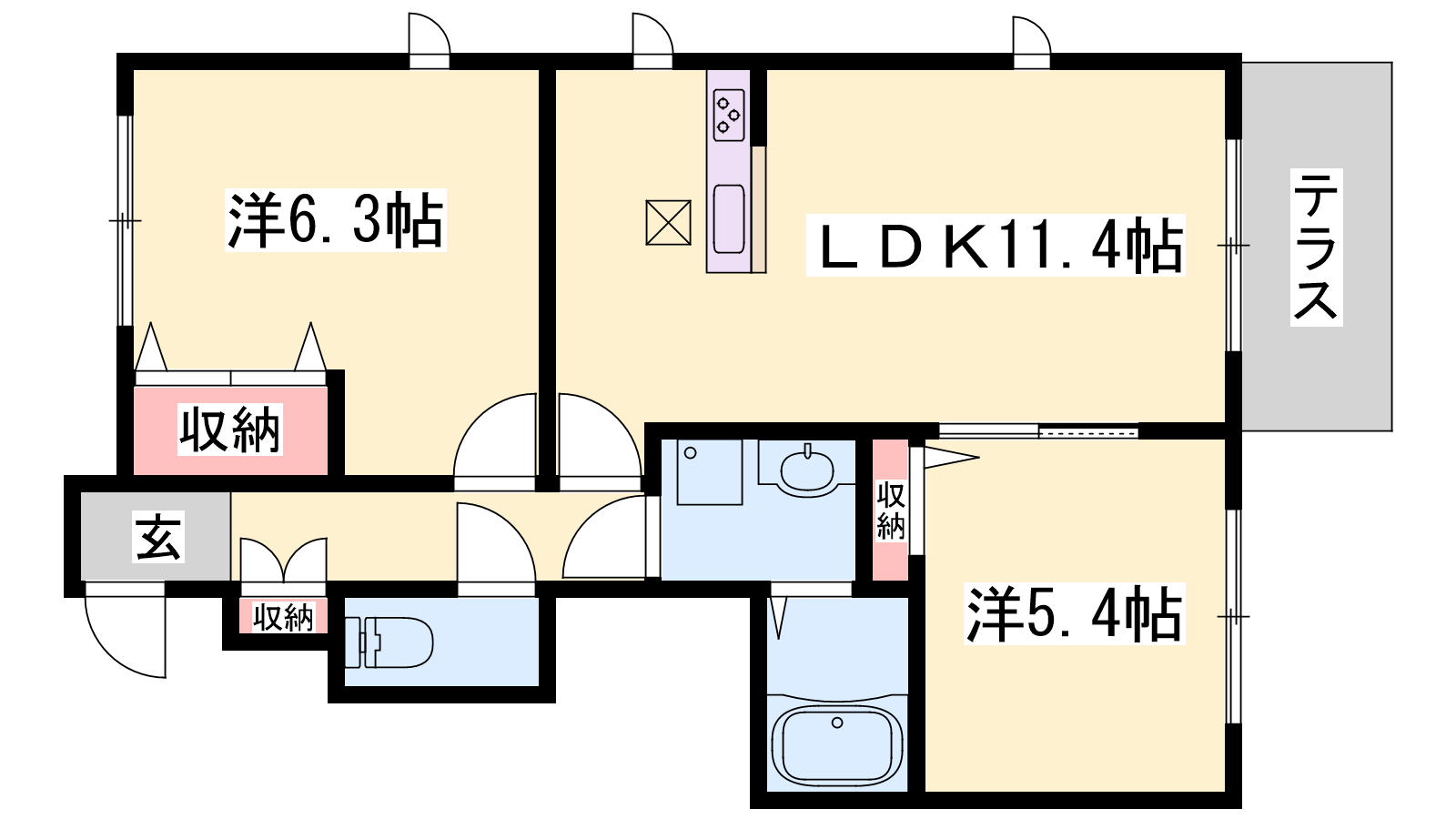 - LDK11.4帖、洋室6.3帖、洋室5.4帖