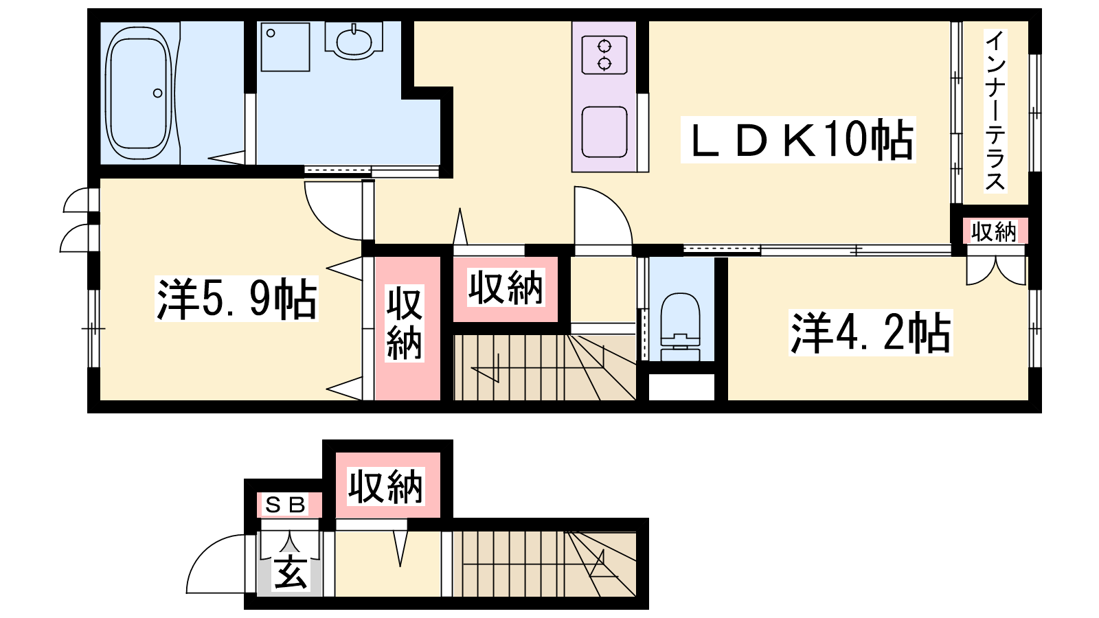 - LDK10帖、洋室5.9帖、洋室4.2帖