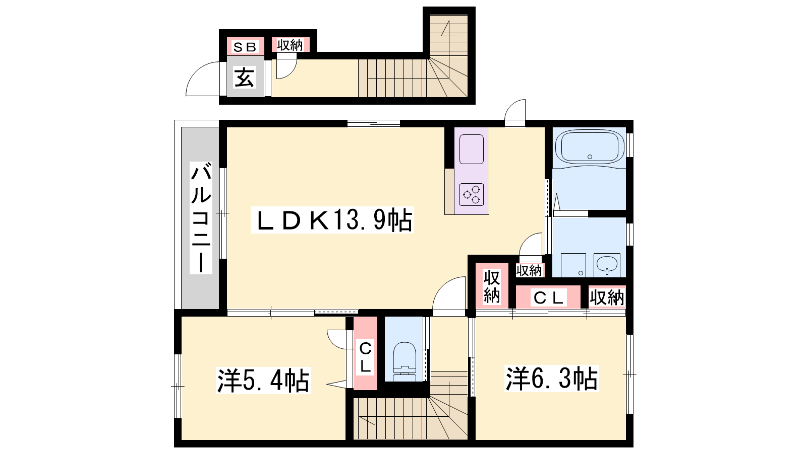 - LDK13.9帖、洋室6.3帖、洋室5.4帖