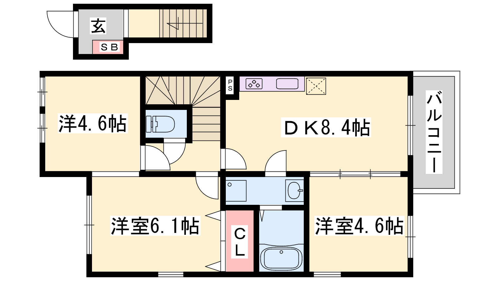 - DK8.4帖、洋室6.1帖、洋室4.6帖、洋室4.6帖