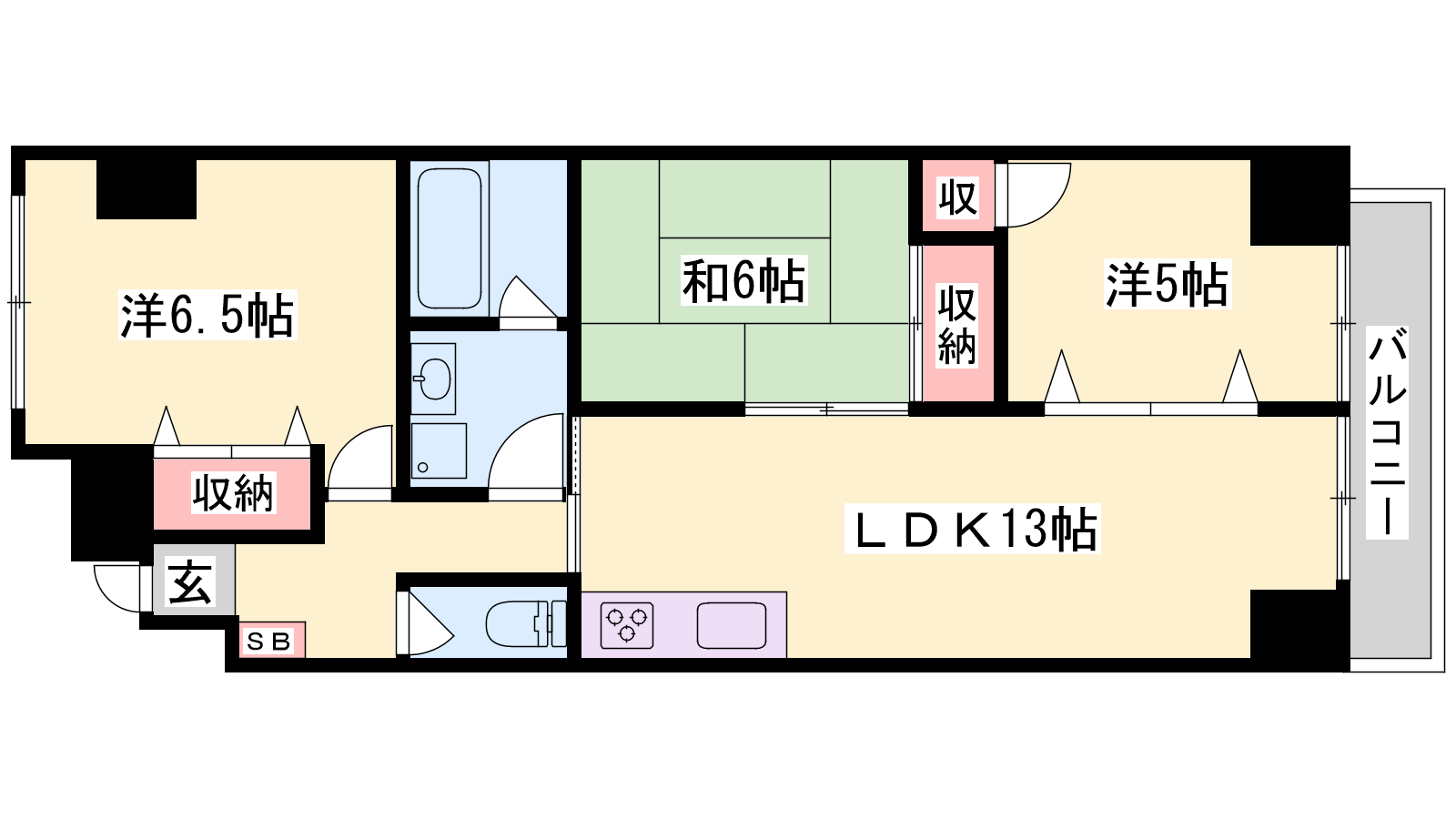 - LDK13帖、洋室6.5帖、洋室5帖、和室6帖