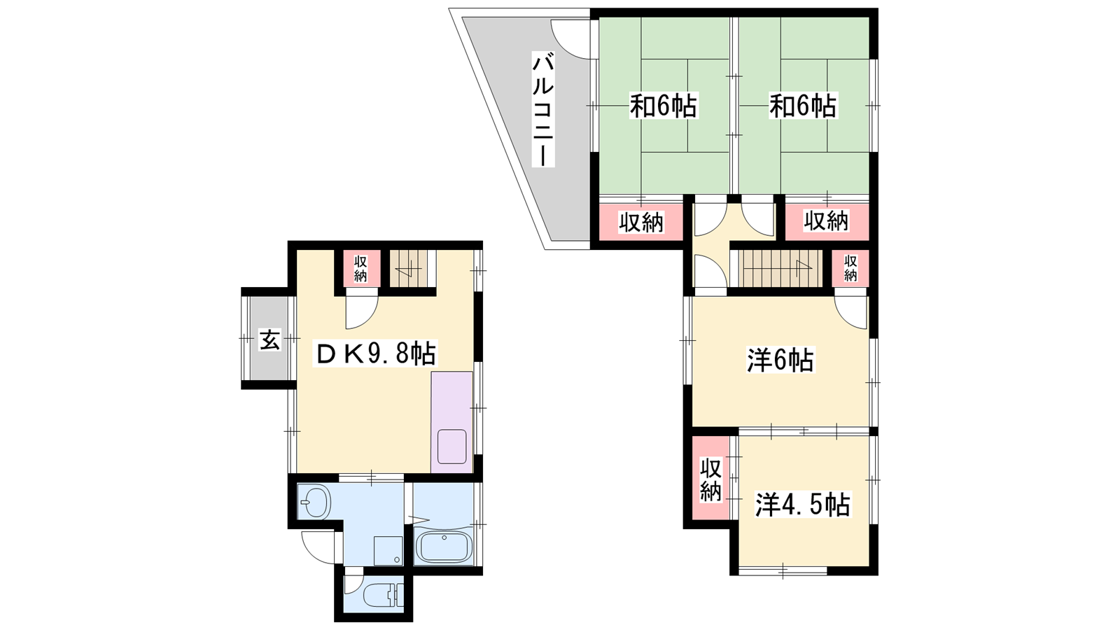 - DK9.8帖、洋室4.5帖、洋室6帖、和室6帖、和室6帖
