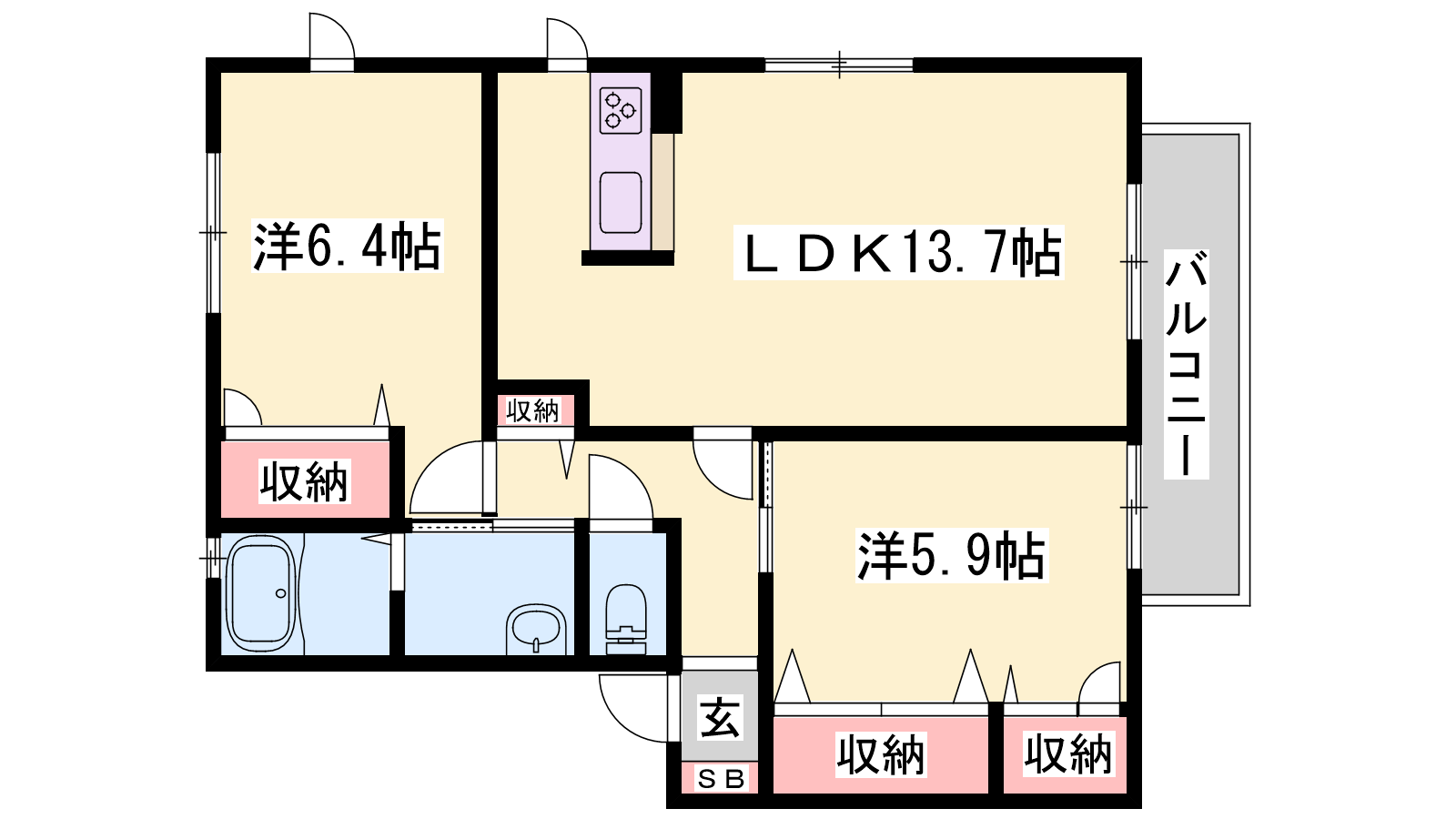 - LDK13.7帖、洋室6.4帖、洋室5.4帖