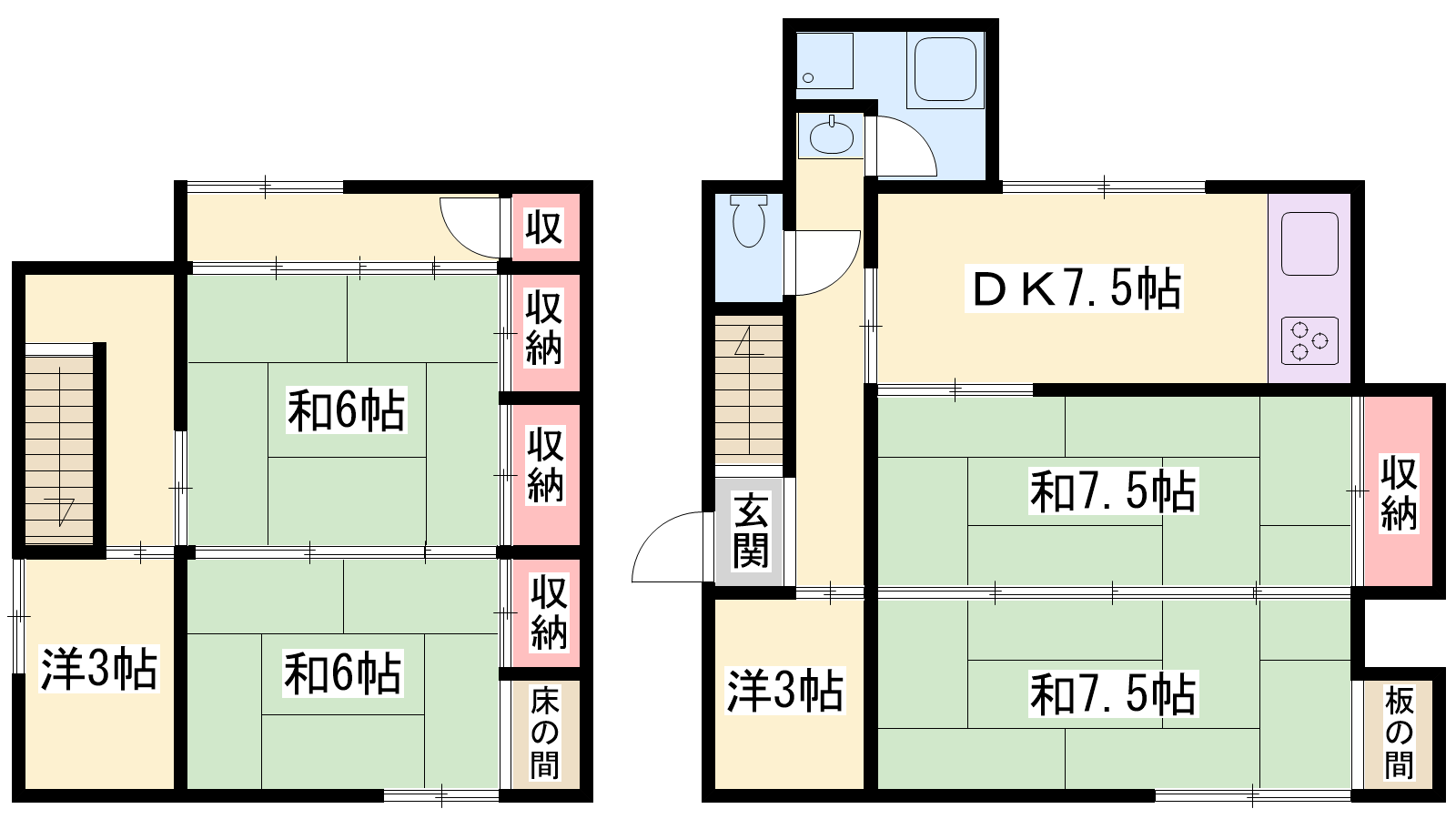 - DK7.5帖、洋室3帖、洋室3帖、和室7.5帖、和室7.5帖、和室6帖、和室6帖