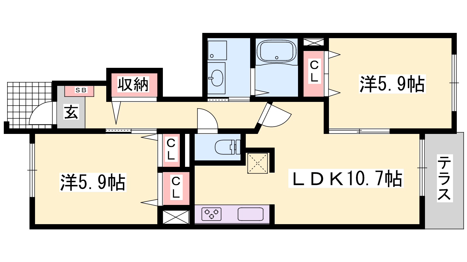 - LDK10.7帖、洋室5.9帖、洋室5.9帖