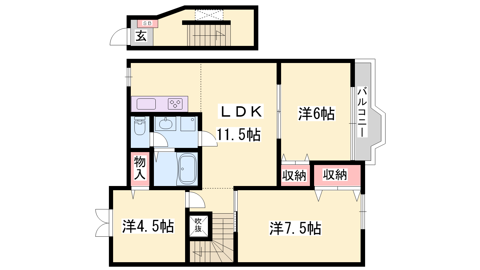 - LDK11.5帖、洋室6帖、和室7.5帖、洋室4.5帖