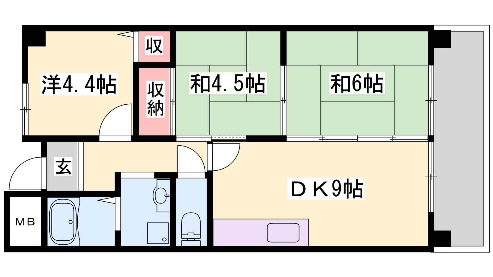 - DK8帖、洋室4.4帖、和室6帖、和室4.5帖