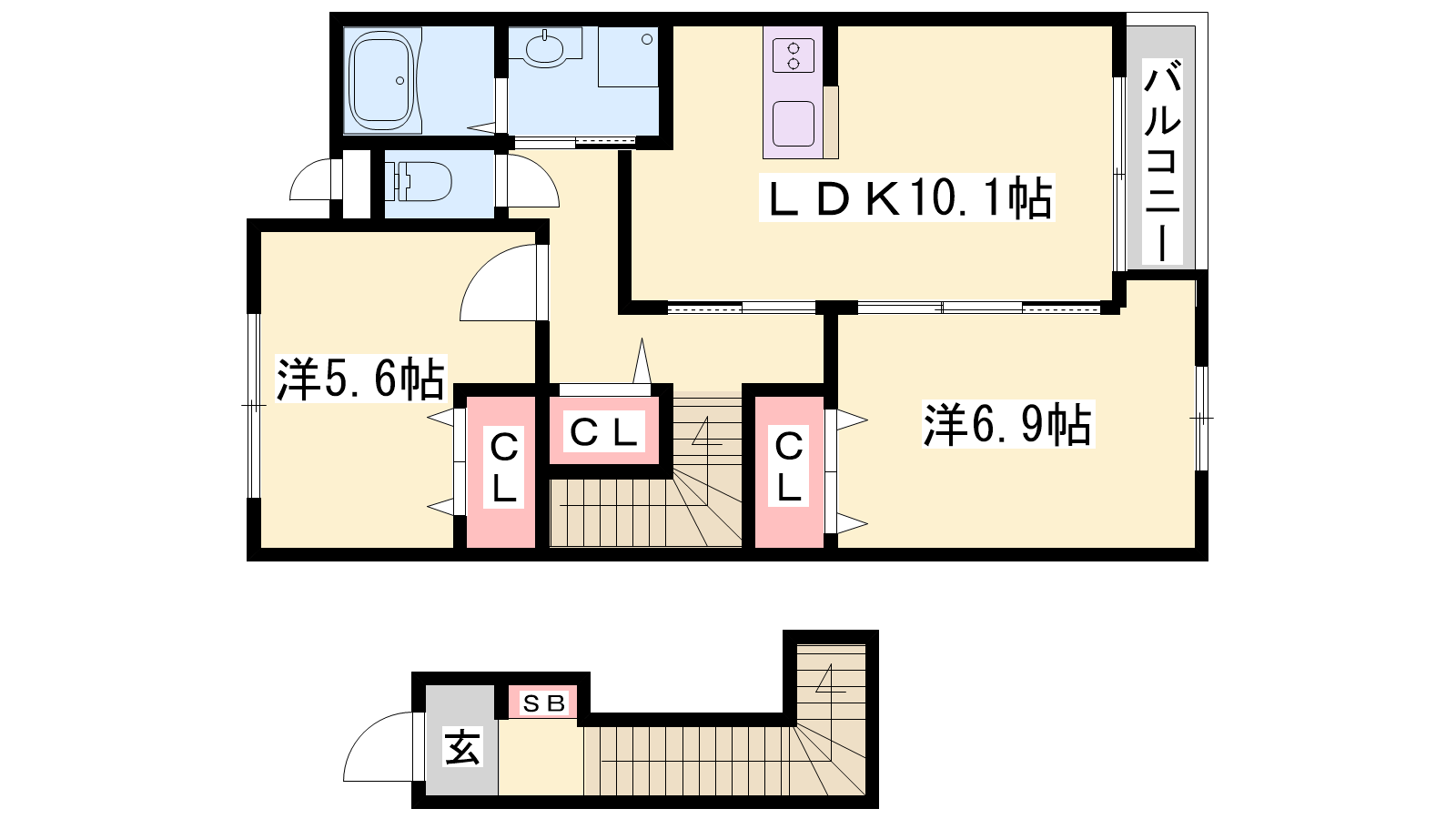 - LDK10.1帖、洋室6.9帖、洋室5.6帖