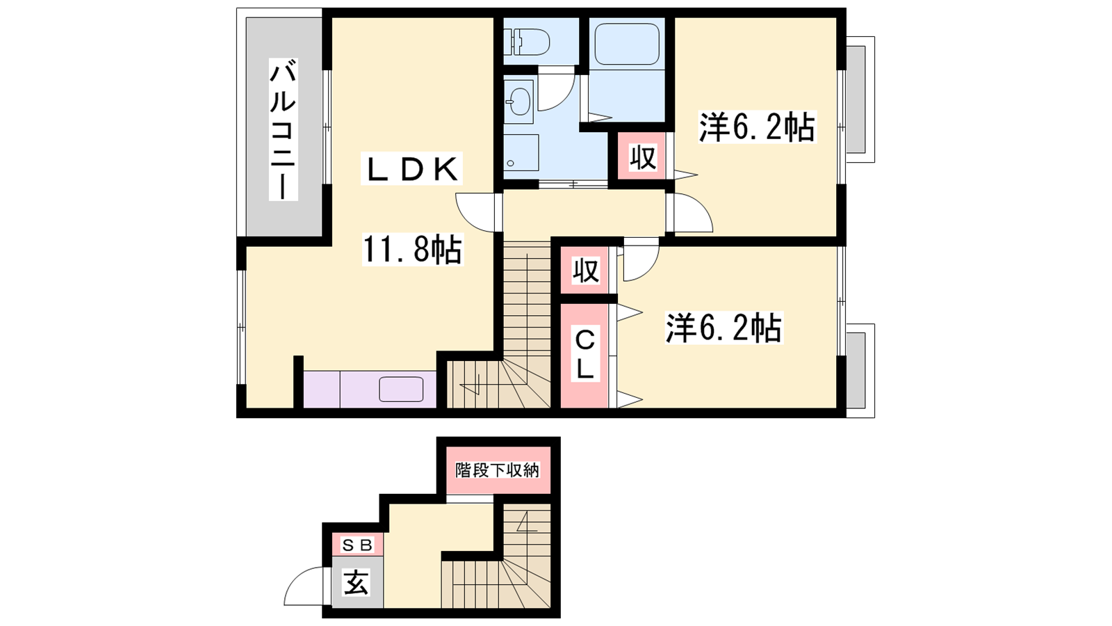 - LDK11.8帖、洋室6.2帖、洋室6.2帖