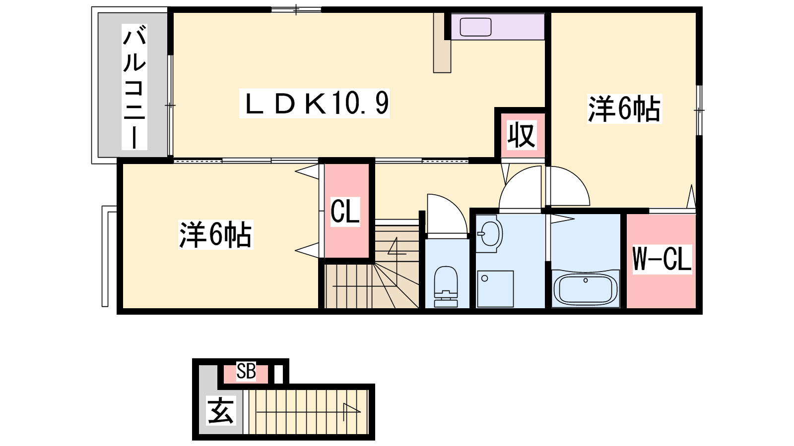 - LDK10.9帖、洋室6帖、洋室6帖