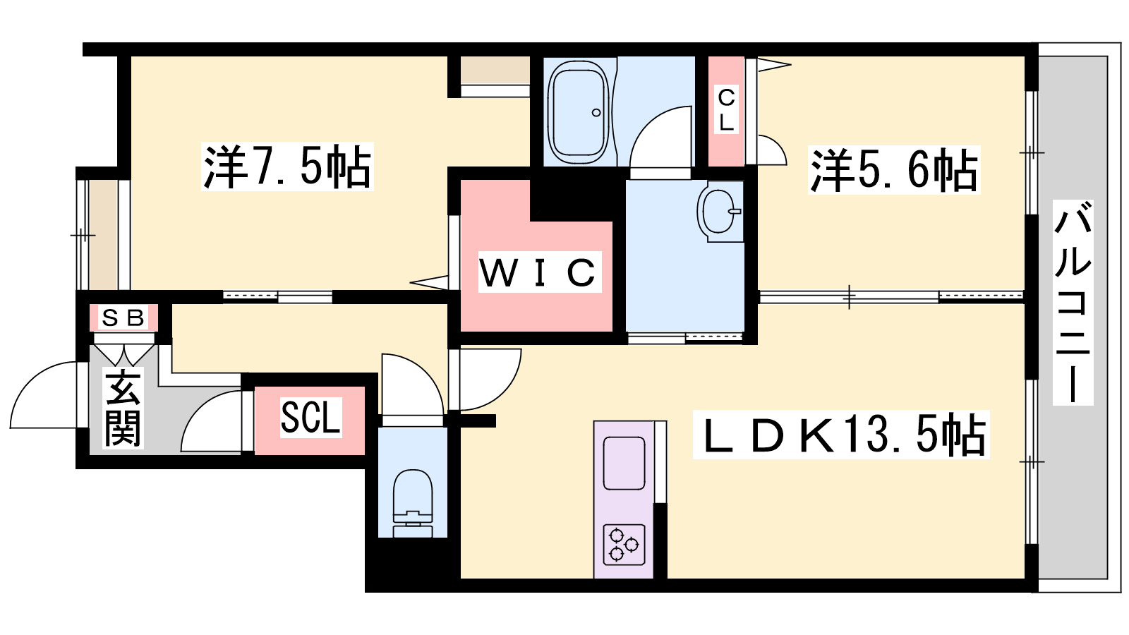 - LDK13.5帖、洋室7.5帖、洋室5.6帖
