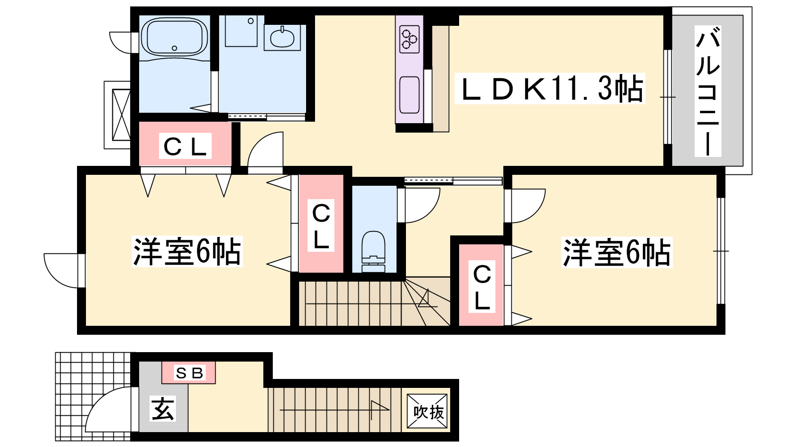 - LDK11.3帖、洋室6帖、洋室6帖