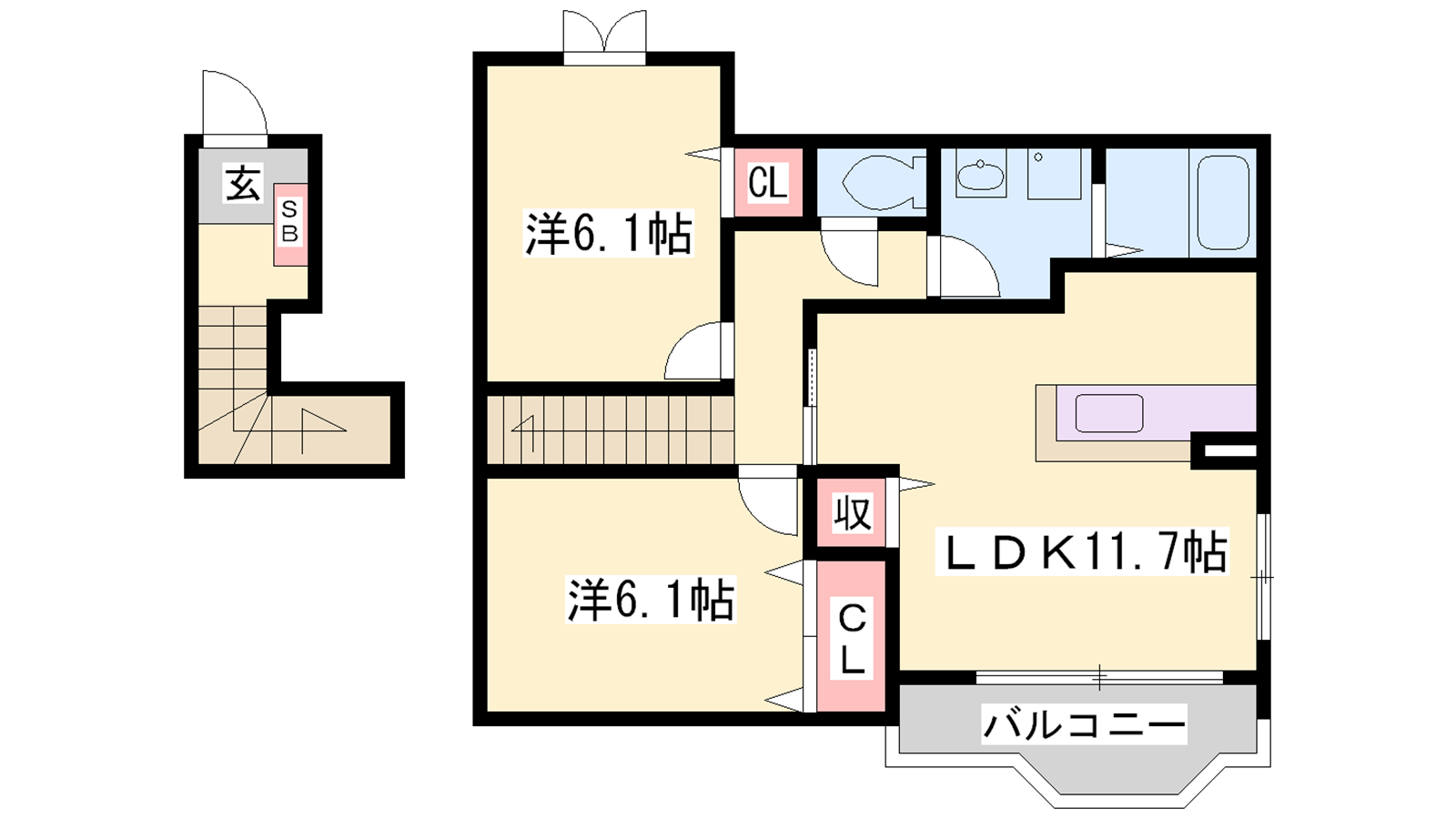 - LDK11.7帖、洋室6.1帖、洋室6.1帖