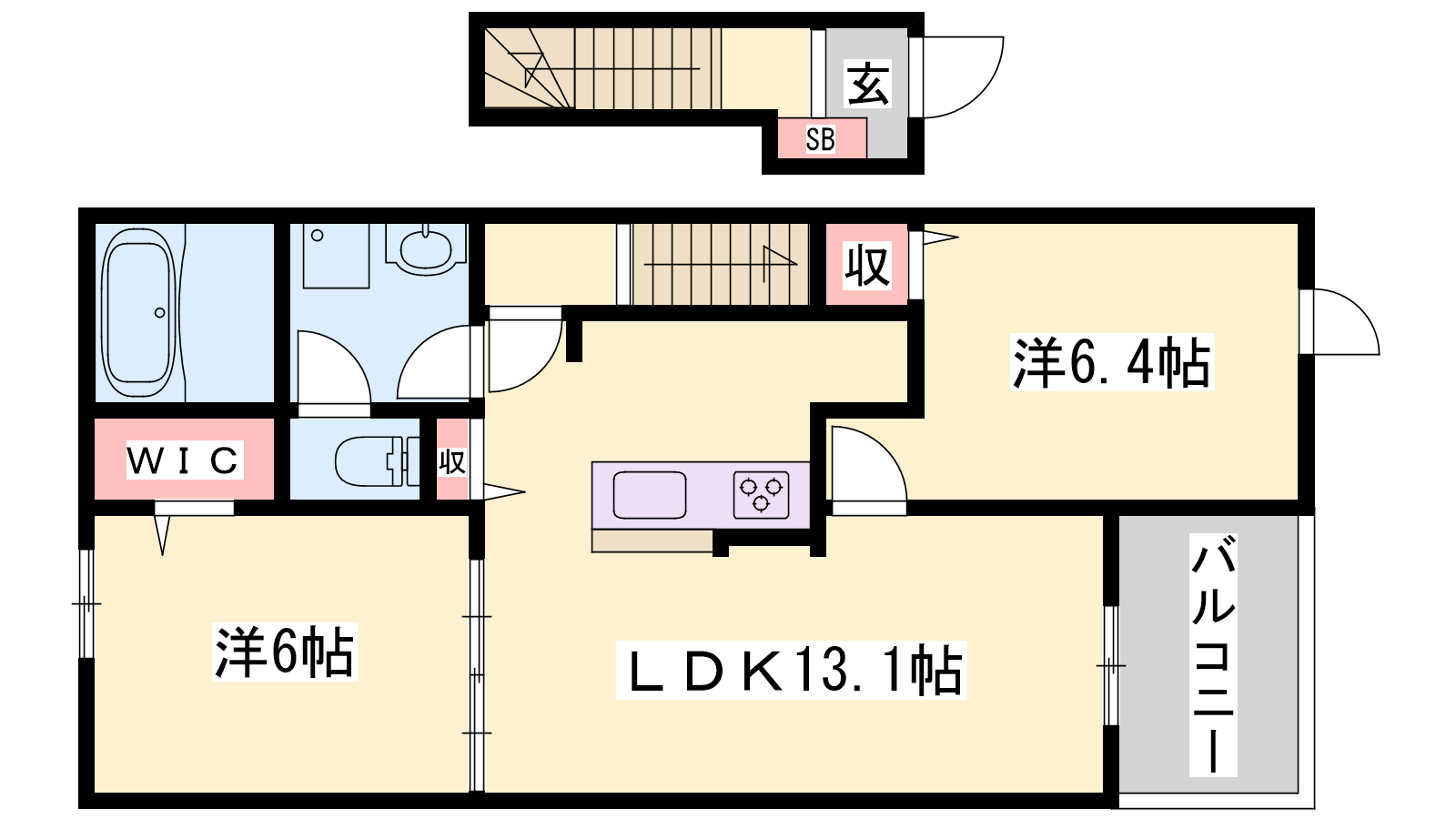 - LDK13.1帖、洋室6帖、洋室6.4帖