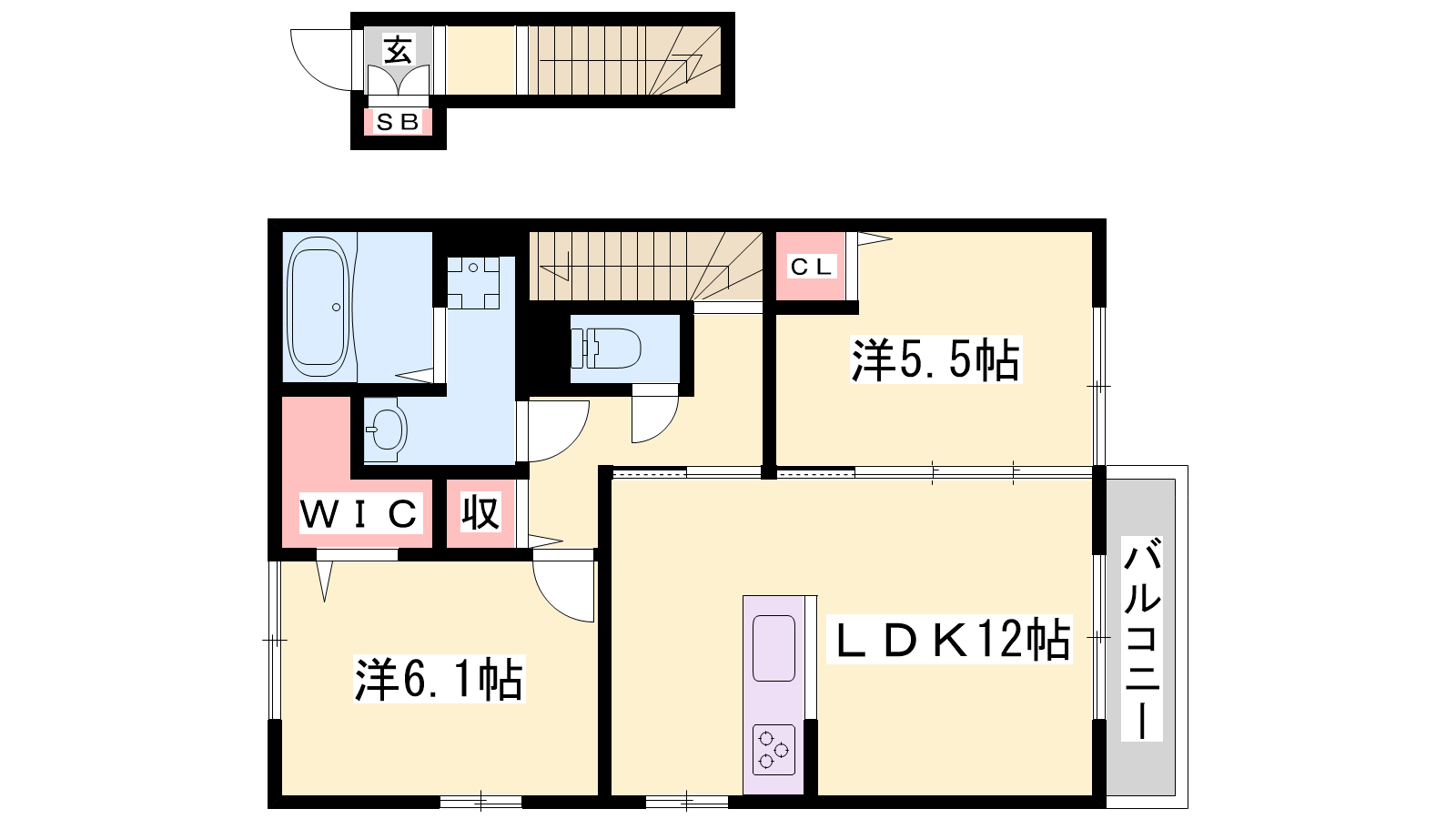 - LDK12帖、洋室6.1帖、洋室5.5帖