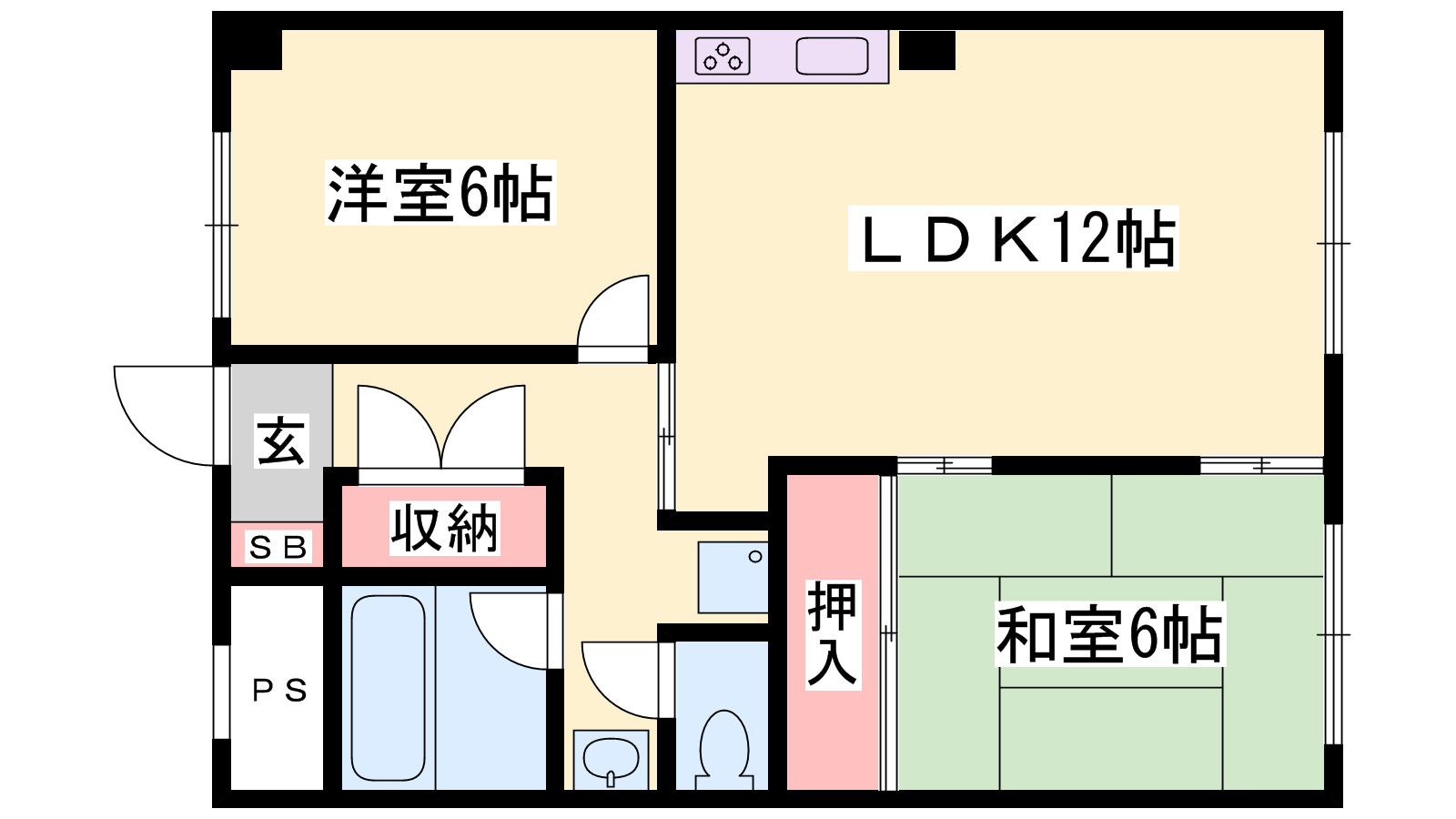 - LDK12帖、洋室6帖、和室6帖