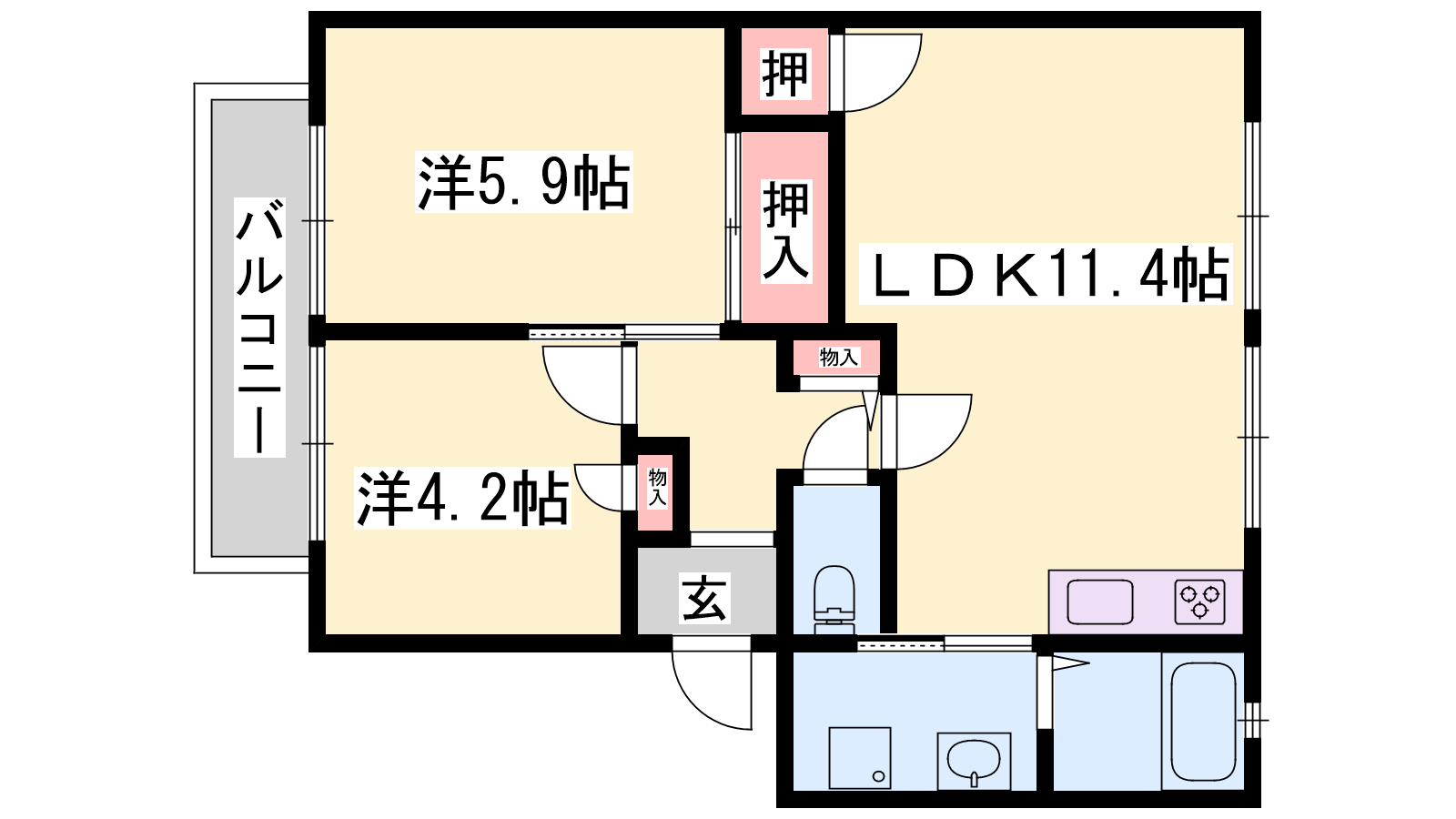 - LDK11.4帖、洋室4.2帖、洋室5.9帖