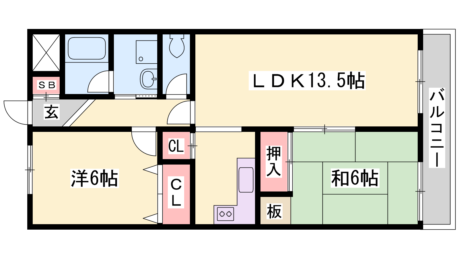 - LDK13.5帖、洋室6帖、和室6帖