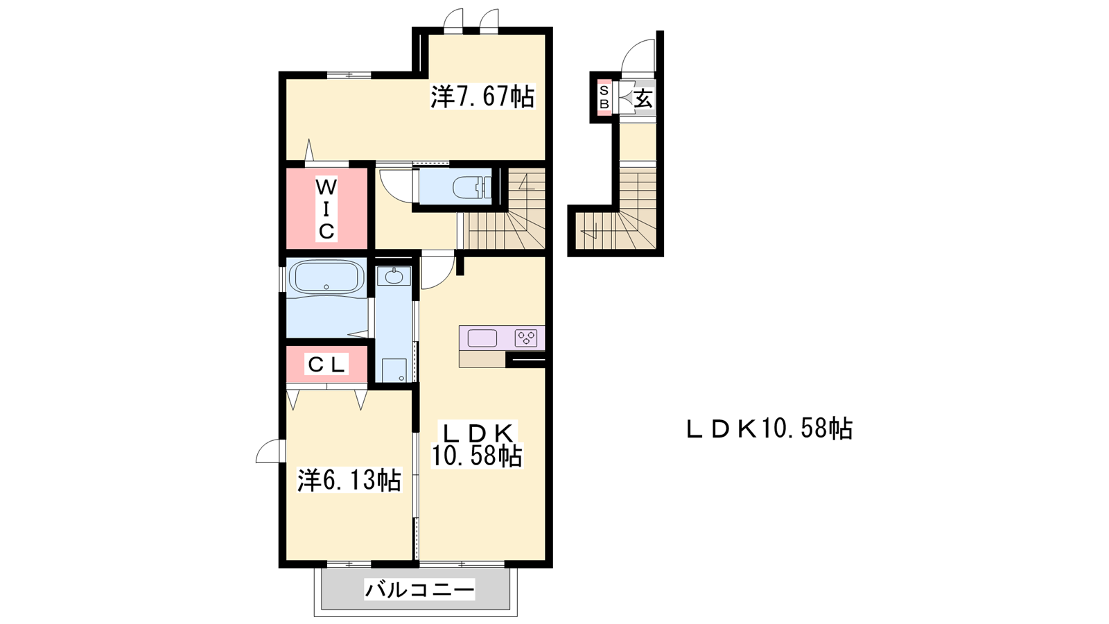- LDK10.58帖、洋室7.67帖、洋室6.13帖