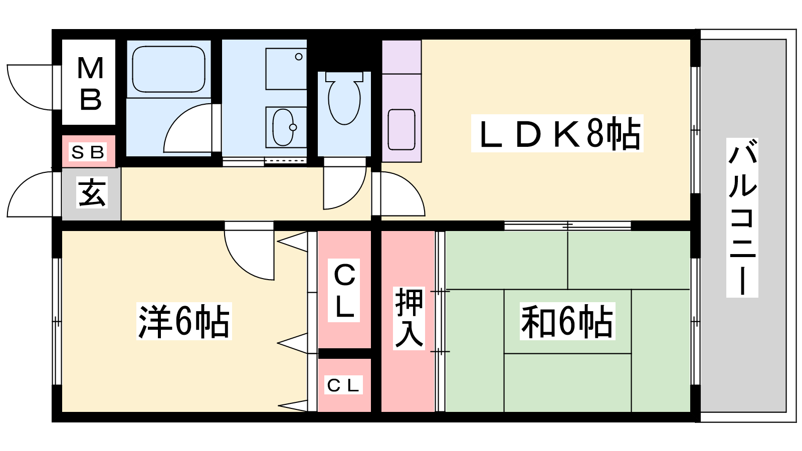 - LDK8帖、洋室6帖、和室6帖