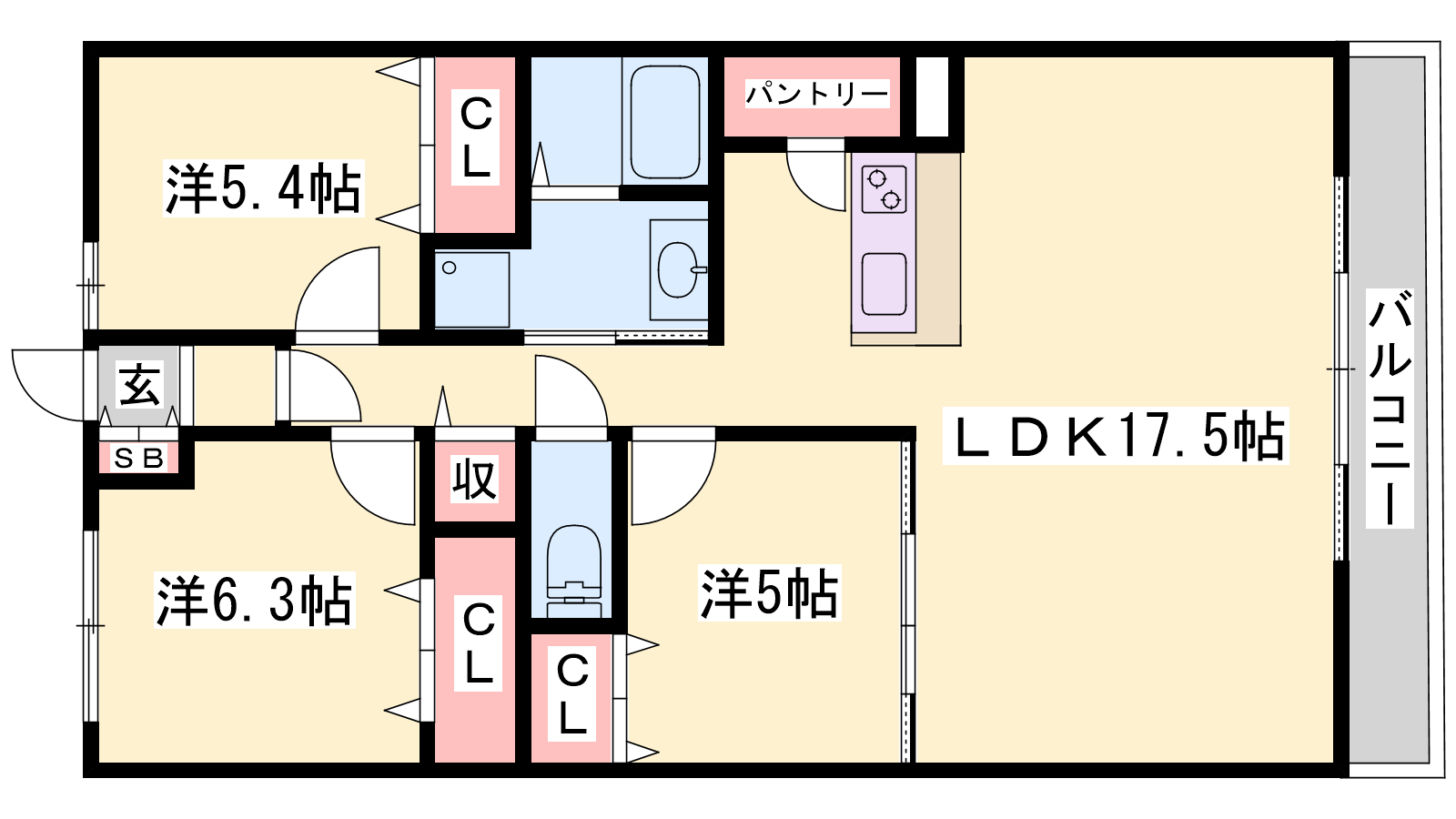 - LDK17.5帖、洋室6.3帖、洋室5帖、洋室5.4帖