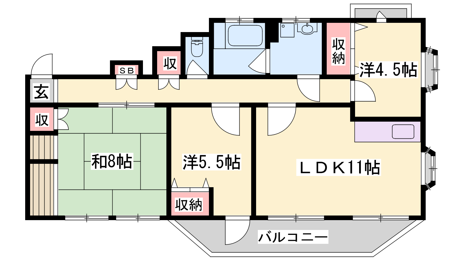 - LDK11帖、洋室5.5帖、洋室4.5帖、和室8帖