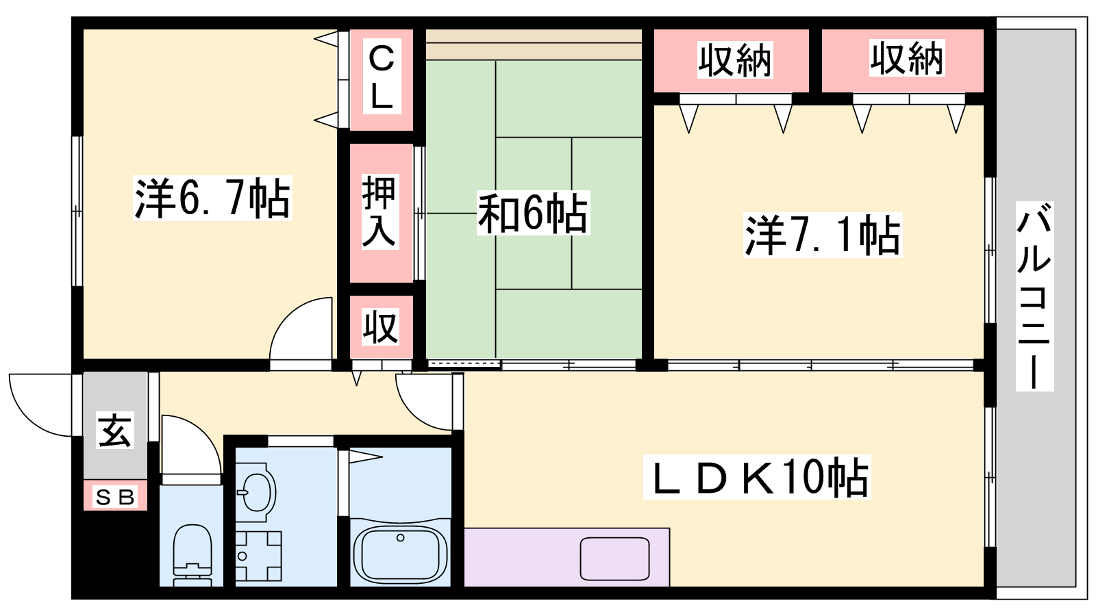 - LDK10帖、洋室7.1帖、洋室6.7帖、和室6帖