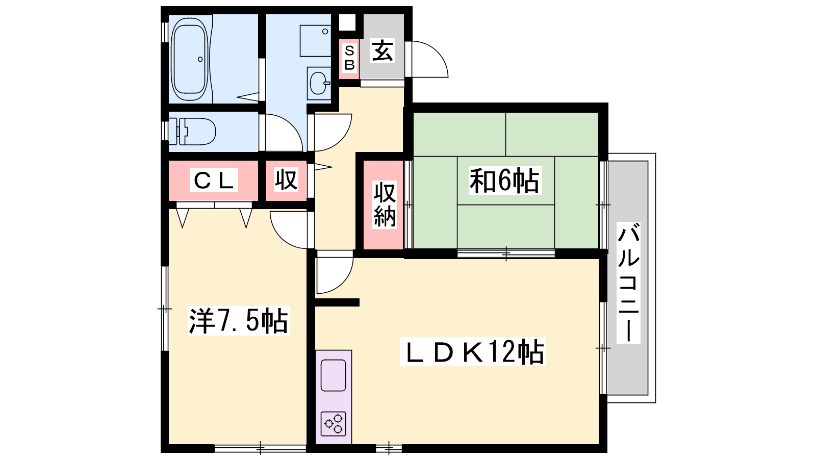 - LDK12帖、洋室7.5帖、和室6帖