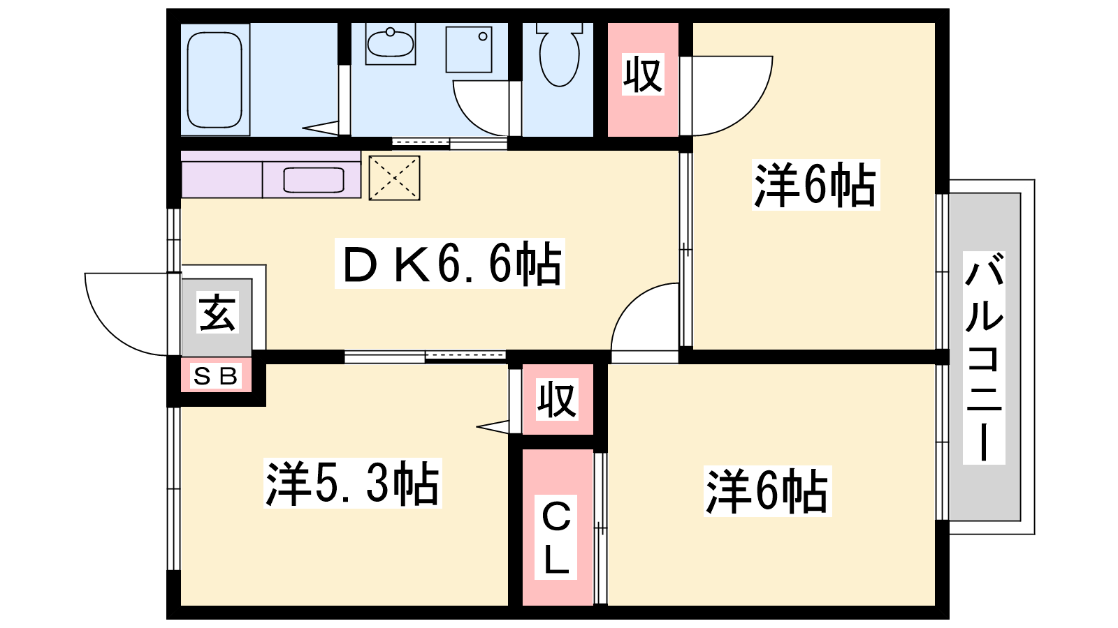 - DK6.6帖、洋室6帖、洋室6帖、洋室5.3帖