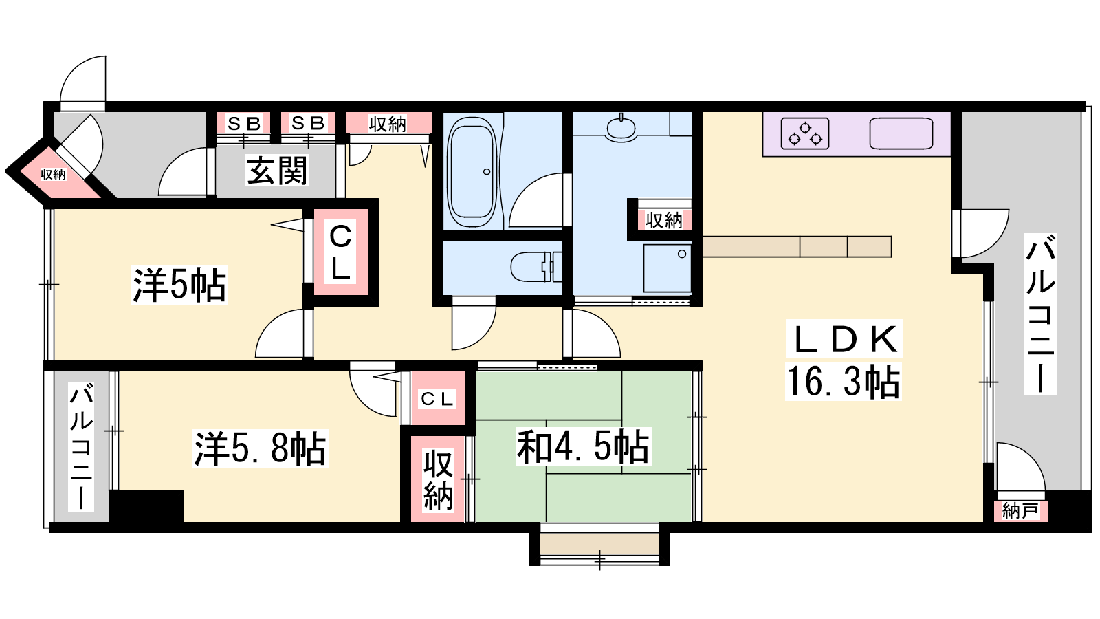 - LDK16.3帖、洋室6帖、洋室5.8帖、和室4.5帖