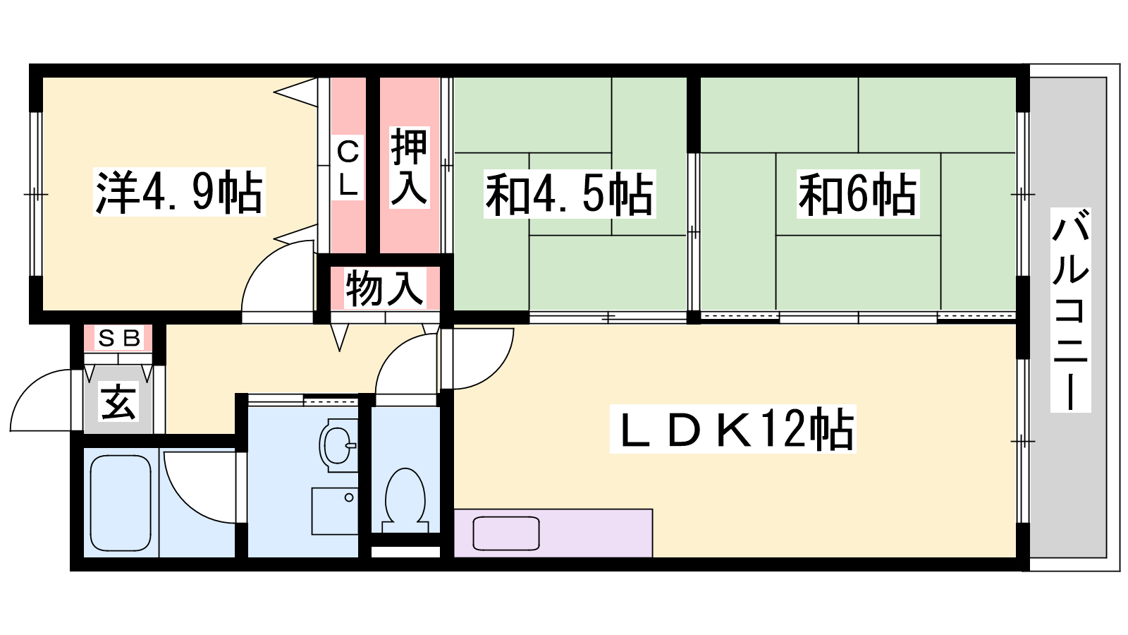 - LDK12帖、洋室4.9帖、和室6帖、和室4.5帖