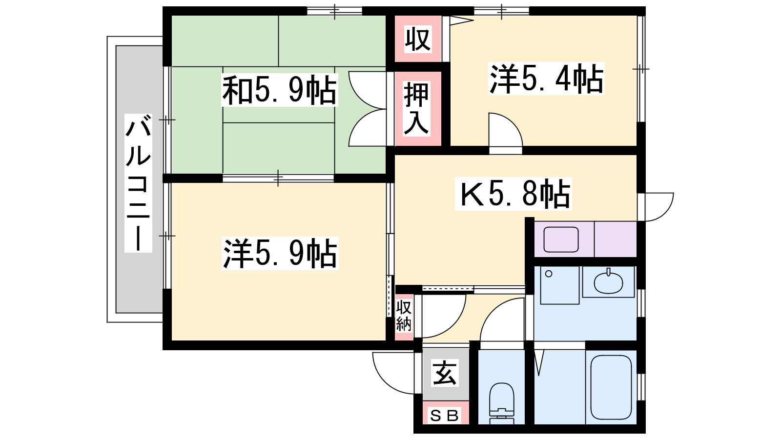- K5.8帖、洋室5.9帖、洋室5.4帖、和室5.9帖