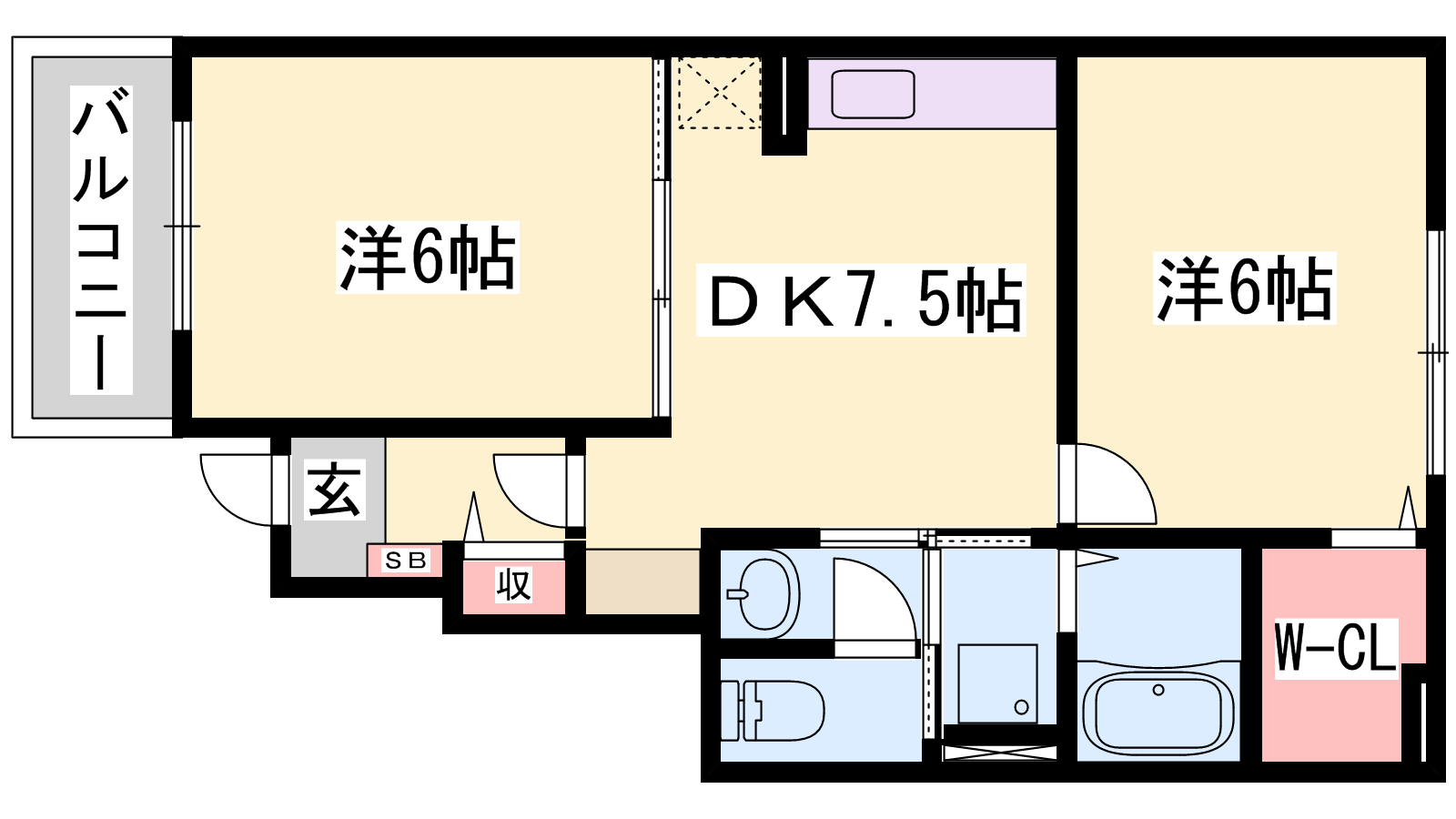 - DK7.5帖、洋室6帖、洋室6帖